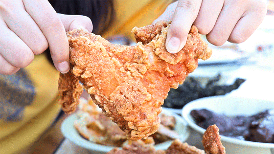 炸鸡翅个头非常大。刚炸出锅,色泽金黄,肉质鲜嫩。