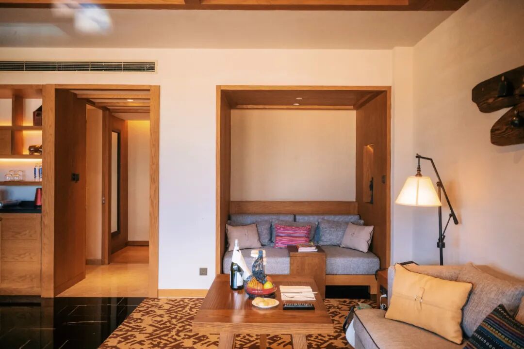 璞修全套房,最小就是86㎡,几乎所有的房间都面对雪山。且有一个大大的阳台,这让你躺着看日照金山、躺着看日月星辰都毫无压力。