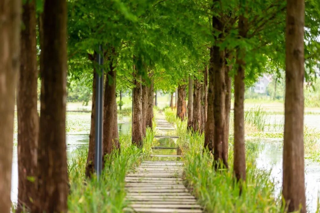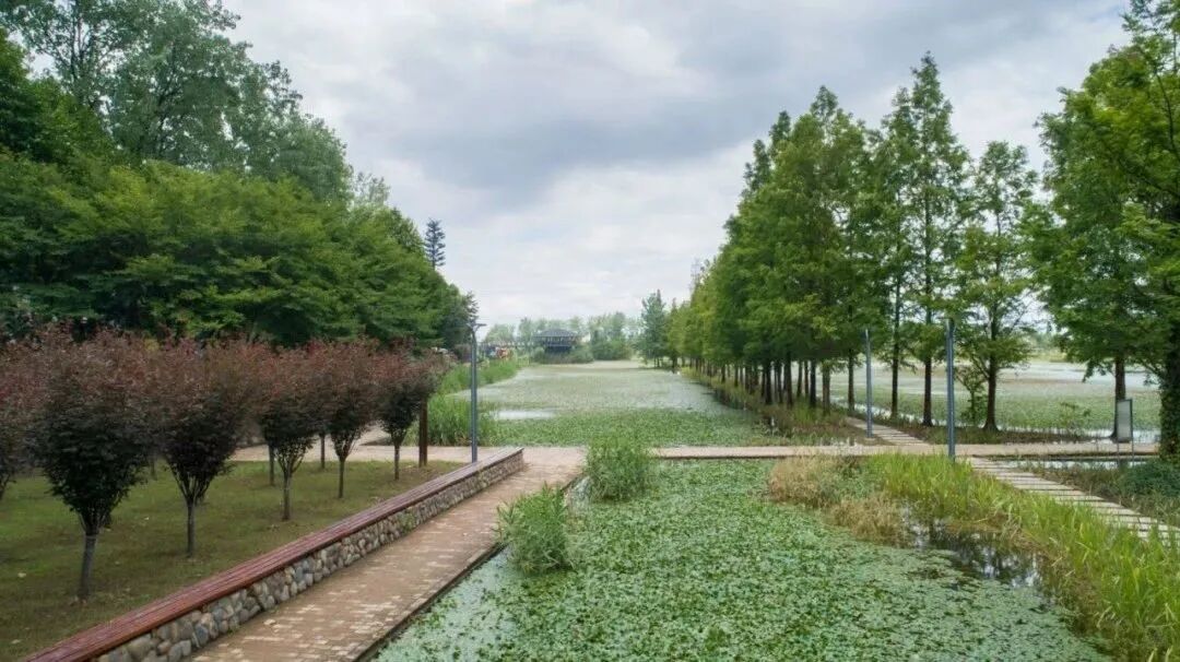 设计保留原有湿地水系,以最少人为干预修复湿地生态,为野生动物提供良好栖息地。公园通过景观绿道串联各个景观节点,沿路设置网球场、滑滑梯、休憩亭等设施,满足居民休闲活动需求。湿地内部结合各类湿地植物设置木栈道、生态步道等,便于居民亲近自然、感受自然。