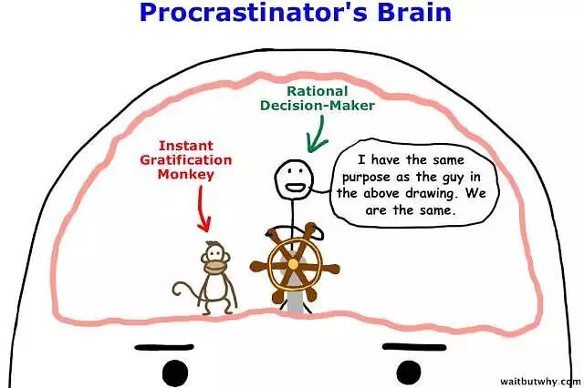 玩乐猴和理性人住在我们的大脑里,相互抢夺我们大脑的方向盘。玩乐猴只活在当下,没有过去的记忆,也不知道未来会怎样,他只在乎两件事情,轻松和有趣。理智人是一个理性决策者,他喜欢展望未来,纵观大局,做长远规划。当我们拖延发作的时候,就是玩乐猴抢过了大脑的方向盘,鼓励我们只做及时行乐的事情。直到dealine逼近,玩乐猴会因为大脑过于恐慌而被吓坏,这个时候理智人才能拿过方向盘,赶紧完成该做的任务。