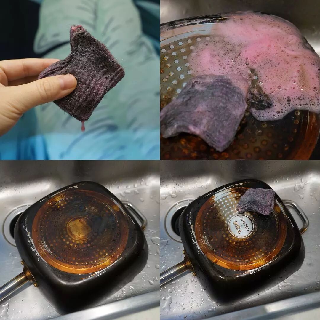 官方建议用于“生锈、烧焦、非常脏”的地方。为了测试效果,特意攒了一只脏锅底,湿水后稍用力擦洗,伴随着非常梦幻的粉色泡沫即可将污渍去除。