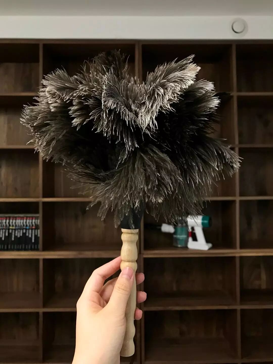 定制开放式书柜的时候,我就买好了这一只鸵鸟毛掸子。再也没有比掸灰更简单的家务了,而灰也因为经常清扫,不会结成一团团絮状物。