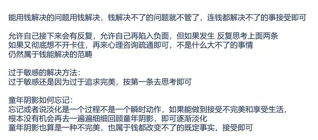 对于我们这种一直相信科学受过高等教育又已经形成了系统性焦虑思维的人,普通人劝几句“想开点吧,别想太多了”不但没有用,反而还会有反效果,必须要有这种像程序一样的带有功能性的方法论植入脑子里,才能像安装了一个杀毒软件一样把脑子里的垃圾分解掉。