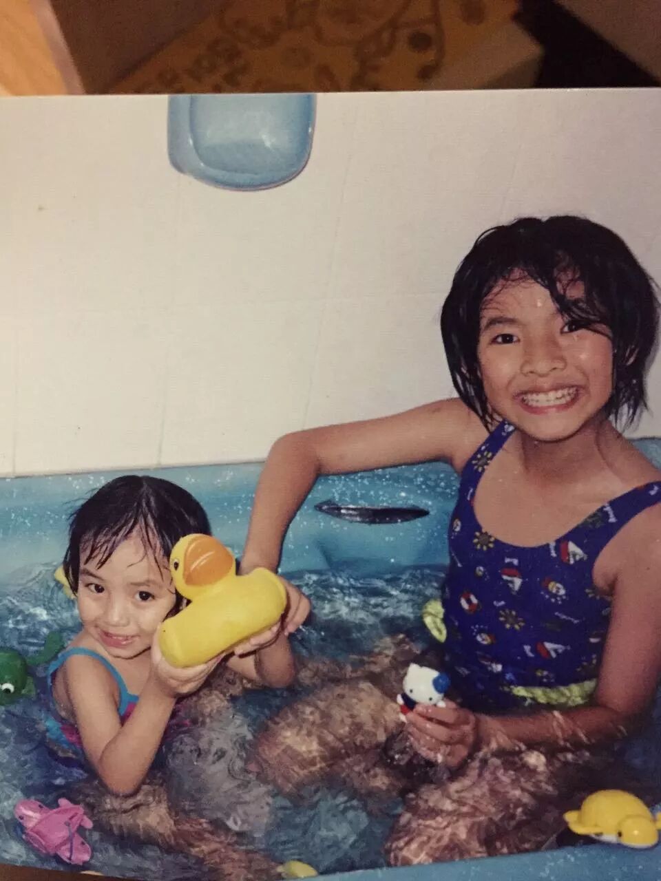 小时候爸爸很喜欢帮我和姐姐拍照,小时候的家有浴缸最喜欢就是洗澡前和姐姐穿泳衣在里面玩。长大之后跟姐姐感觉没那么亲近了但是看到这个图片就会觉得温暖。