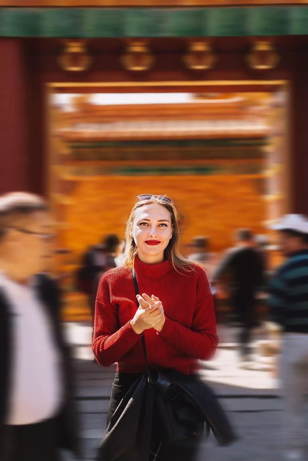 本来我是在等这个门口的人流少一点然后为客片小姐姐拍一张带着好看的门的照片,此时正好这个外国小姐姐从正面走过来,我在取景器里看见她看向镜头的眼睛,然后我几乎是下意识地就按下了快门。然后我们两个同时接连不断说了好几句“sorry”。回来后翻到照片有点后悔当时为什么没有反应过来要给小姐姐看下照片呢,或许还可以留下联系方式,把这张照片送给她呢。