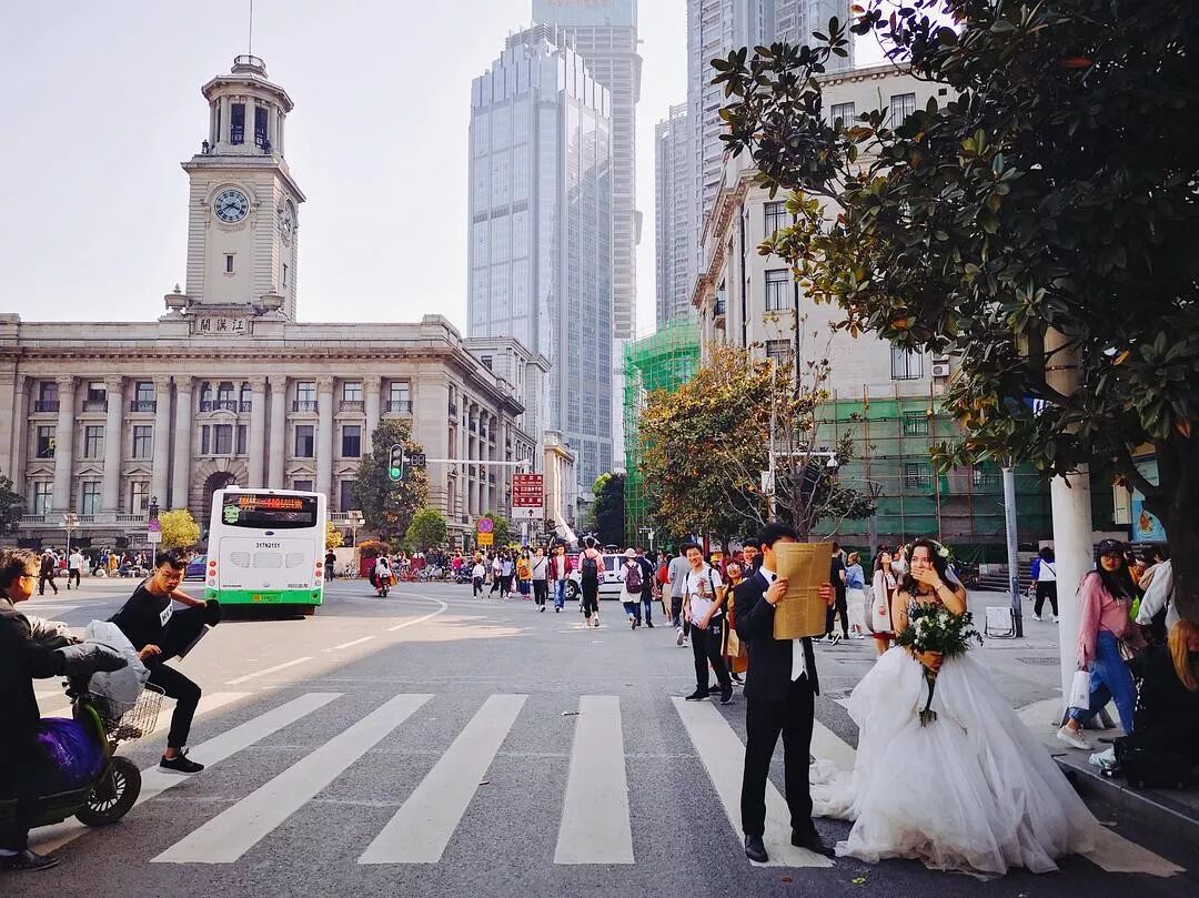 拍婚纱照的新人、张望围观的路人、躲避车辆的行人,没有主体,但却还原了生活细节之处的活色生香。