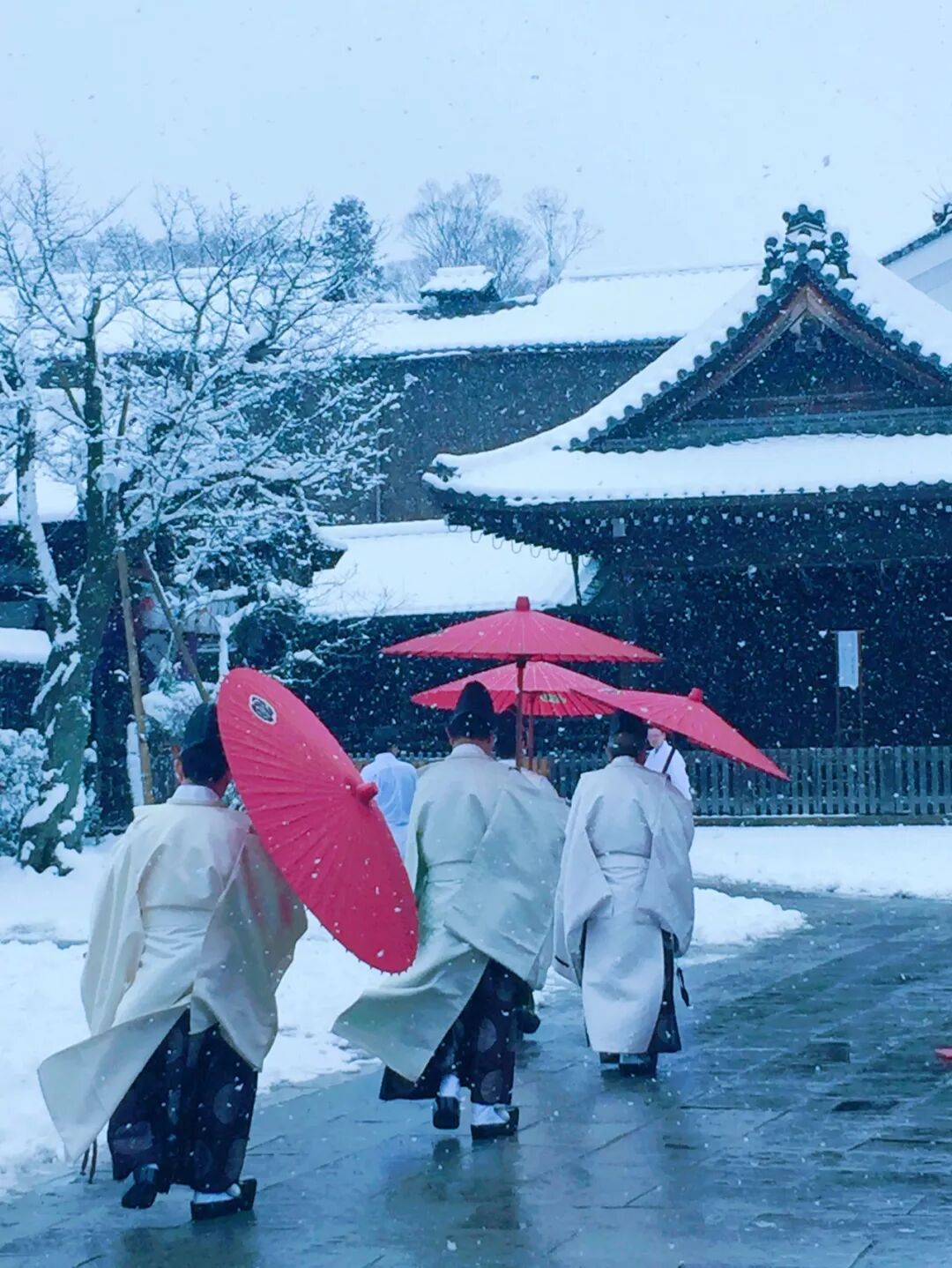 几个神职人员举着伞在初雪中走过