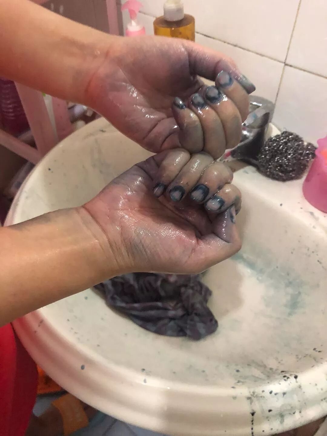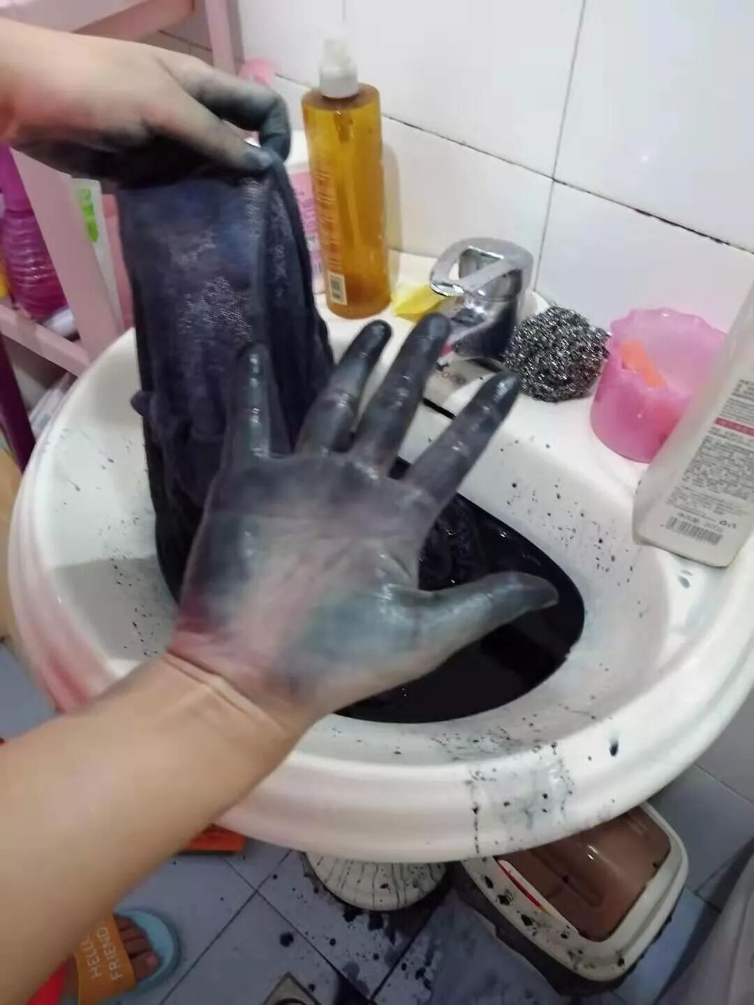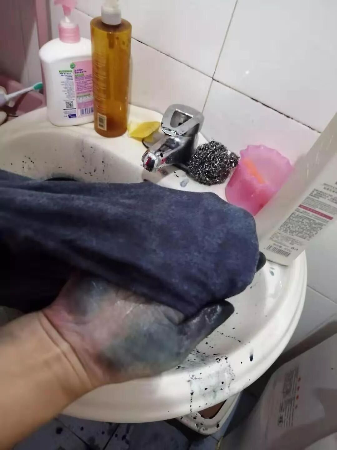 亲妈突发奇想去早市买了件25块钱的衣服,回来一沾水就… 老妈惊慌的叫我。结果就是图片的样子了。有什么方法能拯救这双手么?