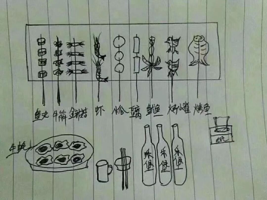 突然想吃烧烤,没钱,没人陪,就自己画一个,不敢画太贵的,啤酒也不敢画太多,怕自己喝多了,没人管!