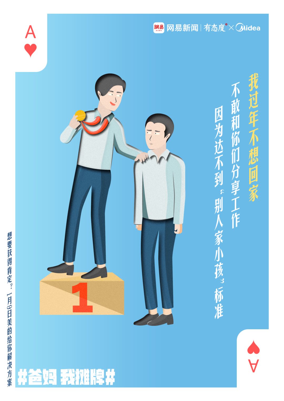 那些吵架也吵不过,装备也不敢穿,回回走亲戚都吃瘪的朋友们,也别太难过,准备一个超大型回车键,回家猛敲,心里默念“消气真言”:看了这么多装备,大家是不是又对过年回家这件事心生一点点期pi待bei呢?当代年轻人连回家过个年都要如此掏空心思,费尽心力,很多人便由此产生了小小遐想:要是能租个人替我回家过年就好了!和我长得一模一样,但比我乖巧懂事一百倍,在家主动做家务,出门见到长辈会叫人,每天十点睡觉七点起床,按时吃饭从不顶嘴,是爸爸的好助手是妈妈的小棉袄。听起来一切都很完美是不是?其实,租个AI替自己回家过年这件事,已经有人在做了呢,只是这个结果嘛......哈哈哈我不剧透,大家自己品品↓美的拍的这个视频,看似沙雕有趣,实际上把年轻人担心自己与爸妈的期待不符,担心自己不够完美,所以春节不想回家,或者说“不敢回家”的内心os摊牌得彻彻底底。所谓的“完美”,并不一定是真的完美。科技再发达,也终究无法复制甚至替代感情。只有“身”回家,“心”还飘在外面,这又怎么能叫“好好过年”呢?孩子有自己的生活方式,一年难得回家一次,父母如果能心平气和地与孩子沟通交流,接受孩子的“不完美”,一家人开开心心团聚在一起,这才是“美的春节”。美的一直强调“人性科技”,让科技不再冷冰冰,而是以现代人的需求为出发点,做“通人性,有温度”的科技产品。上面的视频,也是美的“人性科技”理念的体现。没有居高临下的说教,没有令人不适的恶搞,一切都以亲情为重,用科幻有趣的脑洞传达对家庭关系的思考。在此之前,美的就曾与网易新闻联合发起了一场“春节摊牌运动”,用轻松幽默的“耍大牌”方式,替年轻人向父母正式“摊牌”。每年春节,年轻人回家要面对的各种考验,都会成为热门话题。无论是摊牌还是租个AI,传递的都是年轻人想轻松过年的真心话。希望这个春节,父母能对孩子给予更多理解和包容,让孩子身心同归家,一起过更美的年。希望以后的春节,不再有“年轻人不想回家”的讨论,每个人都能开开心心过大年。