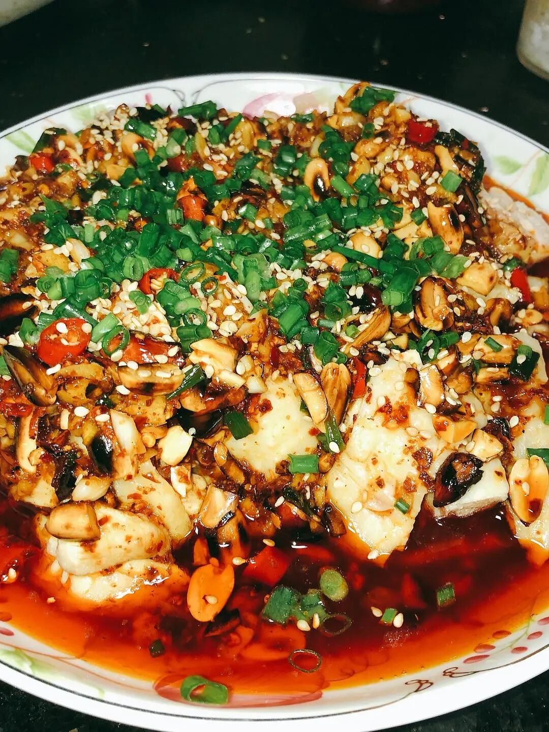 4、酱汁淋在鸡上,加上香菜花生碎(是灵魂!!)。