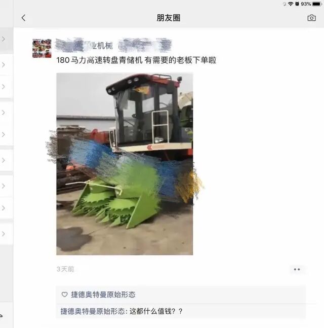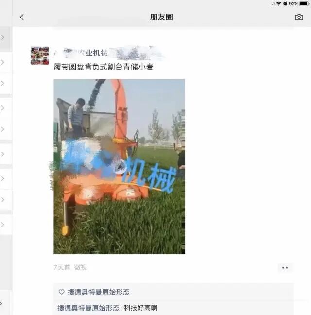 不知道出于什么原因,对方居然没有删除我弟,这真的是一个奇迹…可能他也想看看一个奥特曼用一年级的文化水平,是如何评论他的机械的吧…在我的再三追问下,我终于知道我弟弟是怎么加到这个人的了,他从我奶奶的朋友圈里看到了这个人,他一下子就被收割机吸引住了,出于对“高科技”的热爱,他就把这个的名片推给了他自己,顺利加上对方,现在就能天天看收割机了