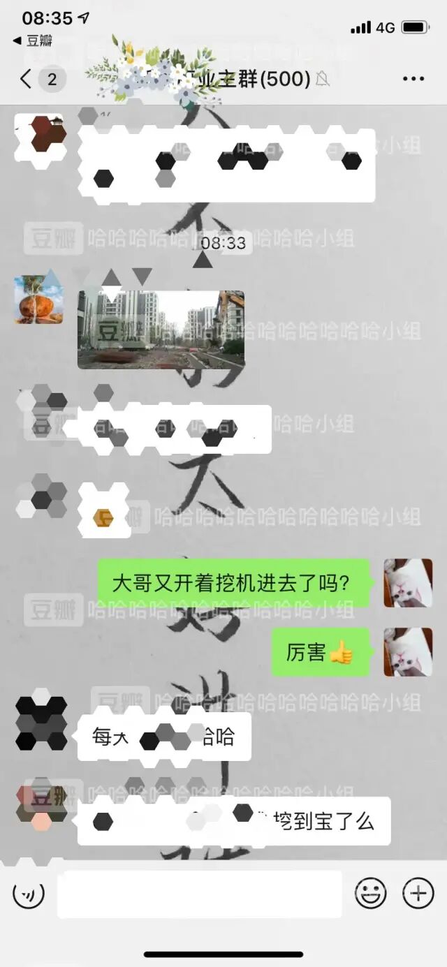 有位大哥在业主群里发了一些照片和小视频,我以为就是寻常的又一次邻居视察分享,结果在群里看着看着发现这大哥是开着挖机混进去的!