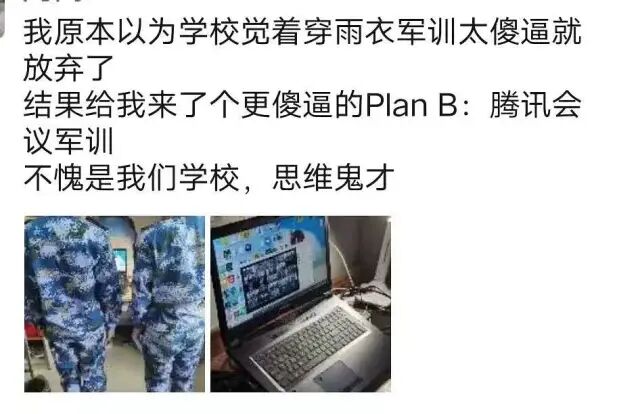 今天一直在下雨,最开始给每个新生准备了雨衣,之后雨大了,就安排新生在寝室开着视频会议军训,没想到下午的时候居然在阳台站军姿哈哈哈。