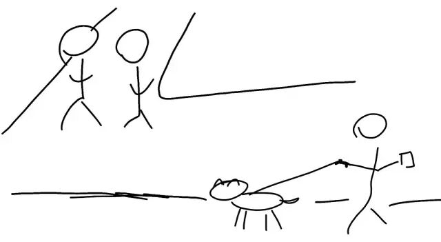 跟隔壁楼主能抱走不一样,我家是边牧,大概四十斤的样子,抱不动还拉不走,站在黑夜中目光灼灼地盯着俩人看,我怎么叫都不理我。那两个人也半天没有结论,我们三人一狗大晚上就在原地僵持了五分钟,大概画面如下: