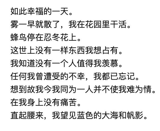 米沃什的《礼物》。七年前在大学课堂上,外国诗歌课的老师带着我们读,当时还不懂这首小诗有多么美妙,多么安宁,多好。