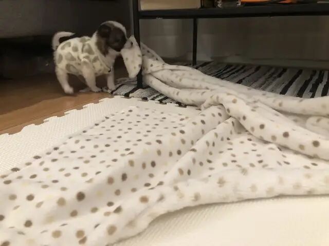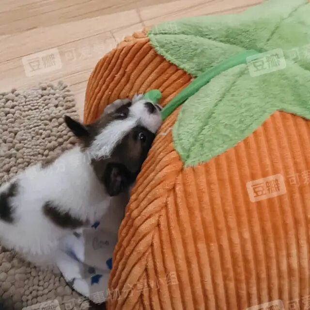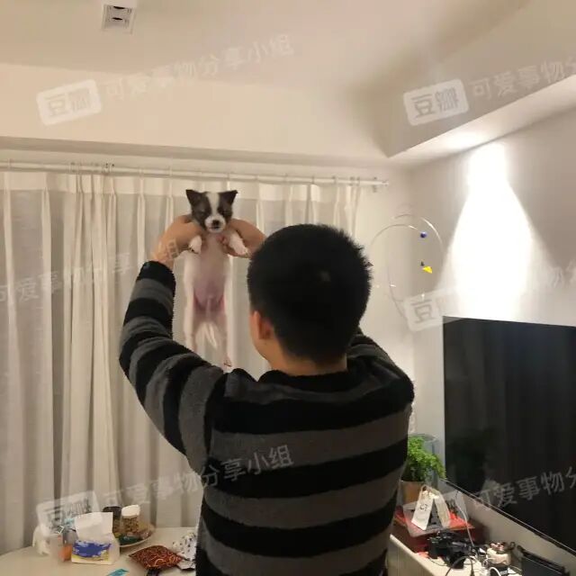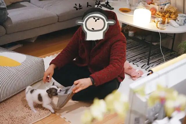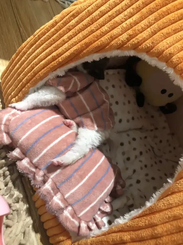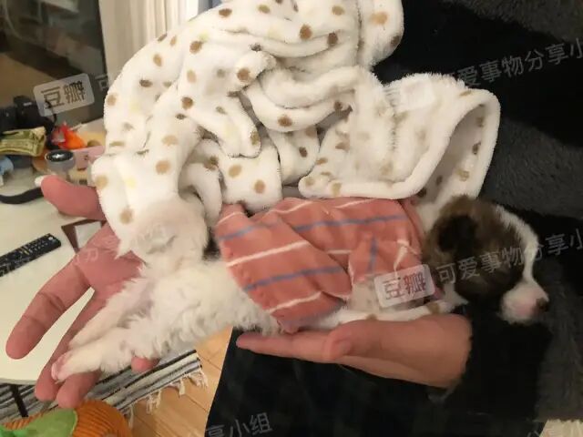 满月之后,狗子开始乱窜了,怕在屋子里着凉,想尽办法给它保暖。买不到合适的小衣服,男朋友妈妈在布料市场挑最柔软的面料,手工缝制了几件。![]()