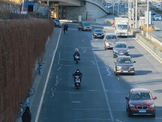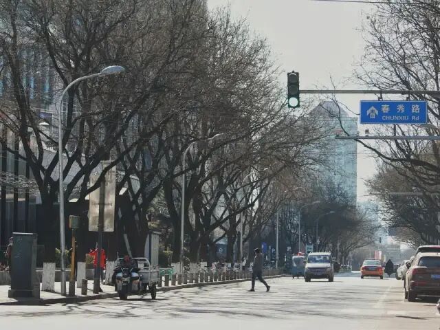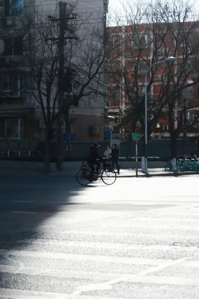 我写诗极为随意,从没想过获得什么认可,只要自己觉得好玩就成,也没给自己下规定,因此写了十来首,尽到兴便停了。不过最近又捡回来这个爱好,因为有了想写的人。如今回过头来看,虽然我那时写的大都是通勤路上平平无奇的见闻,但说不准路子是对的。郑渊洁在微博回复网友的提问“怎么找寻灵感”,他说:“不放过上天恩赐的任何零距离接触生活的接地气机会,比如修车验车,比如倒垃圾,比如出庭,比如回复微博留言,比如买菜做饭。灵感偏爱藏在这些地方。”说起斑马线,就不得不提那些不遵守交通规则的人,比如说下面这个大爷,企图闯红灯,被汽车怼回来,被迫在马路中央来了个瞬间静止。红绿灯路口是路上为数不多我与他人共享时空的气口,人们骑着各式各样的小车,肩并肩等待着,绿灯一亮便四散而去。我们的缘分,维持了仅仅一分钟。偶尔也会出现更高层次的有缘人,比如说那些曾和我在路上“赛车”的人。但大多时候,大家都是各骑各的,擦肩而过,互不相干。骑出左家庄,道路变得宽阔,车少人少,我通常在这一段加速前进。回头望望,到了我很喜欢的一个路口,好几个夏日傍晚,我在这里看到了晚霞。再往前,便是春秀路了,到公司的最后一段路。在某个大路口,早晨的阳光正好被一栋大楼遮挡,因此马路一半阴一半阳。每次等红绿灯,我都“痴迷”于此处的光影。今天终于得偿所愿,拍了几张“不怎么样”的照片。为这条路拍的最后一张照片,离公司百米不到,每回骑到这里我已无心欣赏周遭的风景,只想着躲避车流,穿过马路把车停好,拿出手机打卡,然后钻进大楼,开始一天的女工生活。我无需打卡,无需弓着背坐在电脑前,无需为不重要的人和事花费大量时间。但这不代表我否认在这里的时光,实际上我很珍惜且感激,否则也不会专门为“奔赴它”的路程写一篇文章。这里有我喜欢的人们,在“预备离职”的第一天,也是农历生日的这天,我乖乖坐在楼下等他们吃饭,一如曾经的每个午后。饭后同她们道别,平老师拍了拍我的肩:“你知道我们有多羡慕你吗?所以你一定要努力,过得特别好!”末了她又补充了一句:“我说的好,不是说要有钱,而是要快乐,贼拉快乐!”