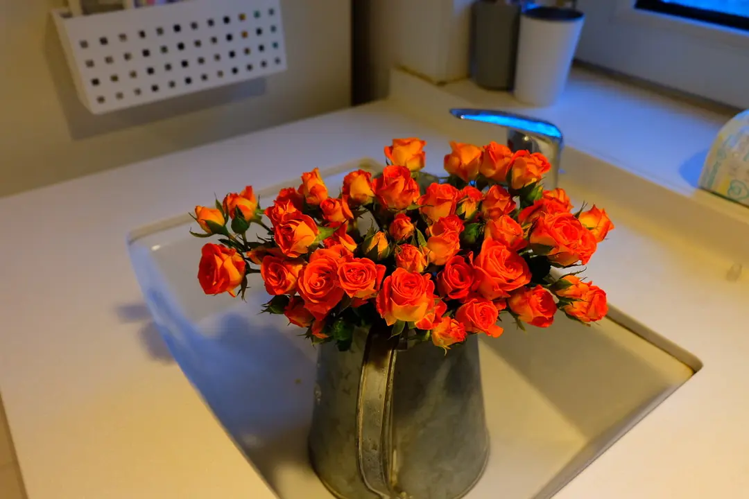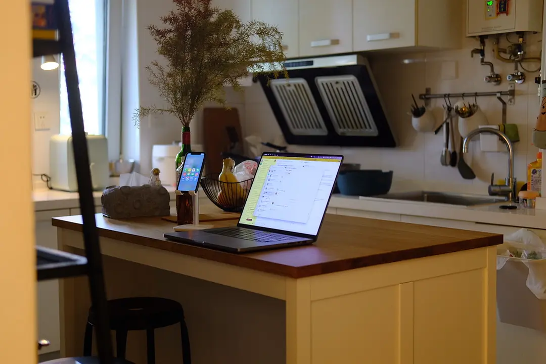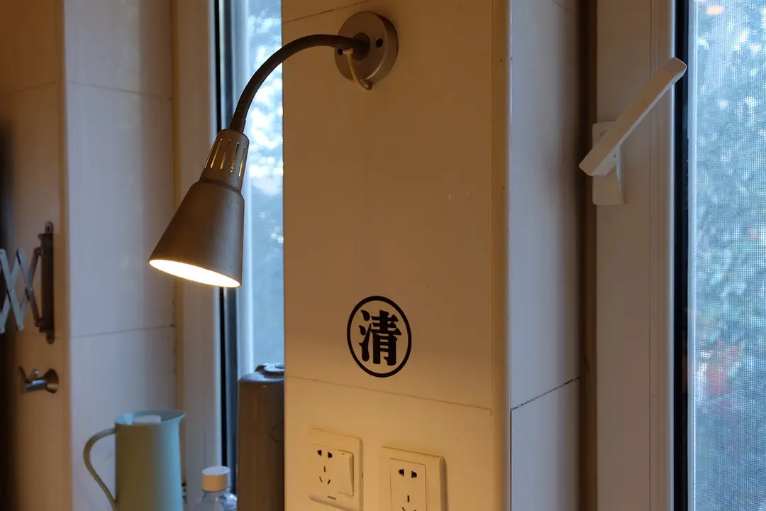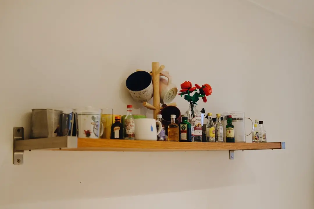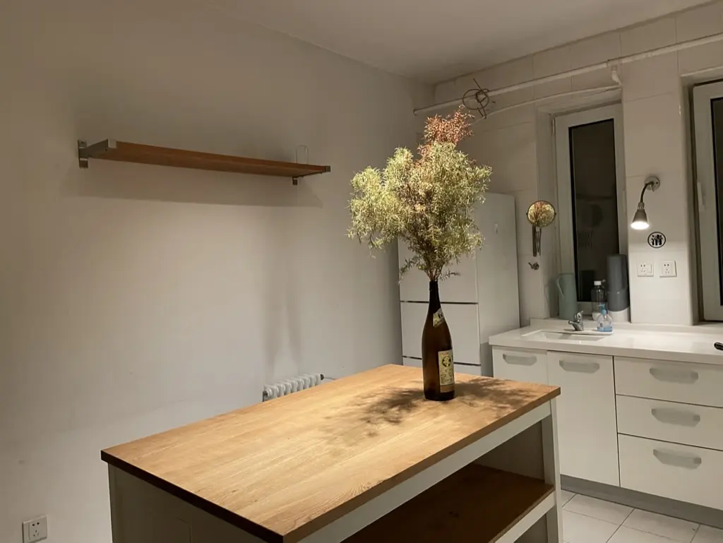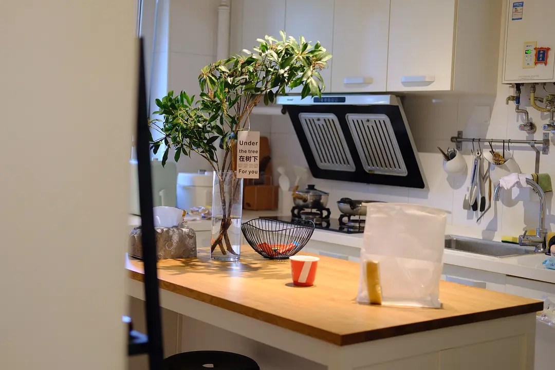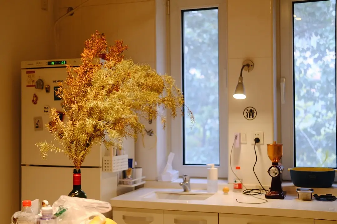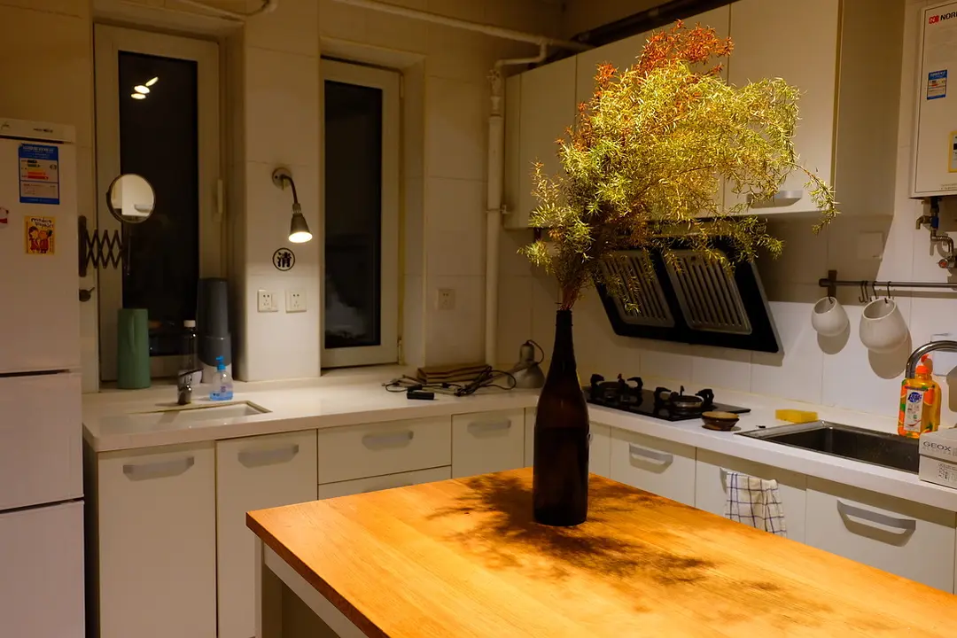 一进门就是厨房。墙上的搁板还有岛台都是房东留下来的。房东还买了桌上的绿植送给我们。冰箱旁边的是洗手台,因为浴室比较小,所以房东把洗漱的洗手台放在了厨房这里。买了磁吸的置物架,把平时洗漱需要的小东西都放冰箱置物架上了。再右边是朋友送的磨豆机,每天喝咖啡会搬出来,用完了再收起来。晚上睡觉的时候有时候会把这个小灯留着。第二天起来看到淡黄的灯光感觉特别好。很喜欢这个白色的台面!白色的背景我也会用来拍一些照片,比如之前在这个操作台上拍了这个:墙上的搁板被我用来当杯具收纳了,一些平时不大会用的马克杯,还有朋友带来的酒,统统上墙:平时工作日早上也会在厨房上班。最近半年都在居家上班,平时早上会在厨房开早会,不需要我说话的时候可以在旁边做简单的早餐。两不误
