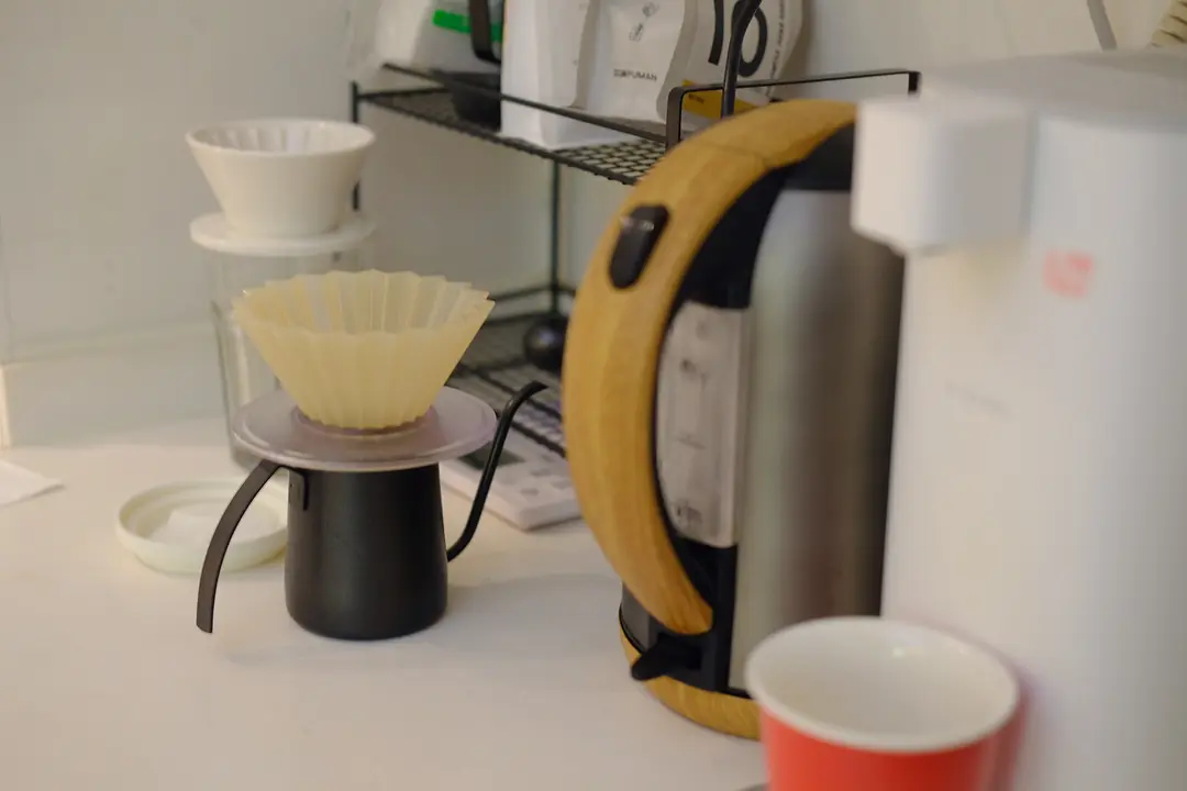在岛台工作厨房里还有一个很小的台面,被安排成了小水吧,放平时手冲的器具还有咖啡豆