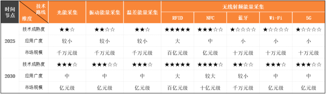 从应用场景上,目前以光能采集、震动能采集、温差能采集以及射频能采集为主的四种无源物联网采能方式中,除了基于RFID和NFC的射频能采集技术相对成熟,已进行较大规模应用外,其余几种采能方式尚处于研究阶段,或者正在若干场景下进行小规模应用探索。展望未来,无源技术有望迎来环境能量采集的研究突破,叠加低功耗计算和通信技术优化,将不断满足更多应用场景的连接需求。智次方·挚物产业研究院对未来近十年不同的无源技术路线在各典型应用场景中的发展成熟度进行了预判,详情如下: