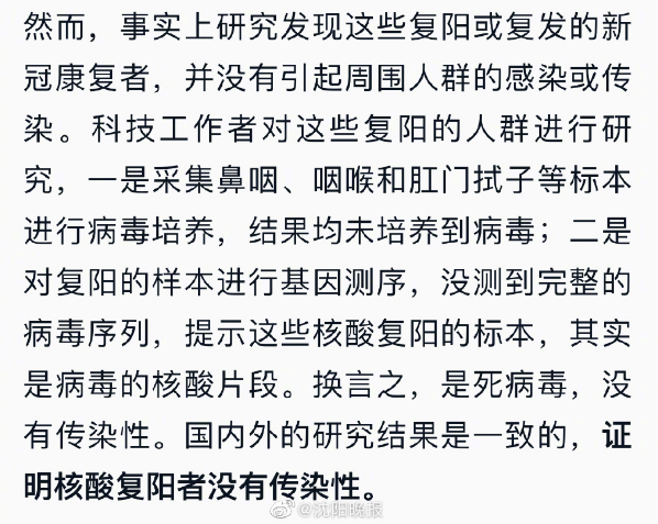 国内外的研究结果是一致的,证明核酸复阳者没有传染性。
