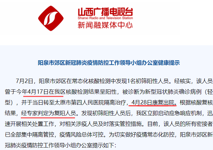 7月2日,山西阳泉市发现一名阳性人员,他曾在4月17日确诊阳性,4月28日康复出院。