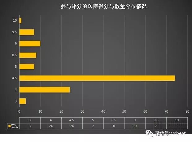 从综合得分与数量情况可以看出,在这135家医院中,有近半数的医院得分集中在4.5分。