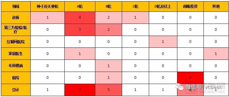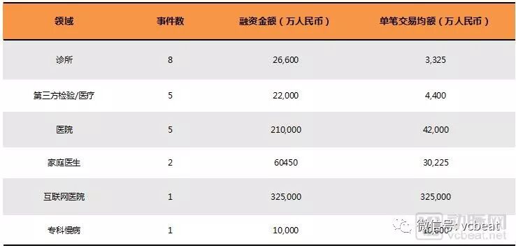 • 医院、互联网医院领域吸金最多,第三方检验/医疗、家庭医生领域融资偏冷;