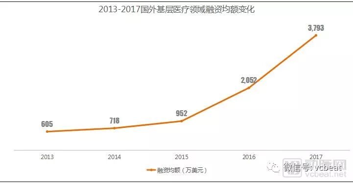 2013年至2017年期间,国外基层医疗领域融资均额持续上升,这是早期项目减少、成熟项目占比上升的缘故。