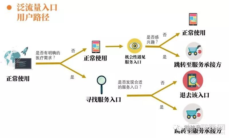 泛流量入口的用户大部分没有即时的医疗需求,但因为超级应用们占领了大部分的使用时间,在这段时间里,用户出现医疗服务需求或者机会性遇见了服务入口,都可能进入到服务的承接方。整个用户路径较长且具有随机性。