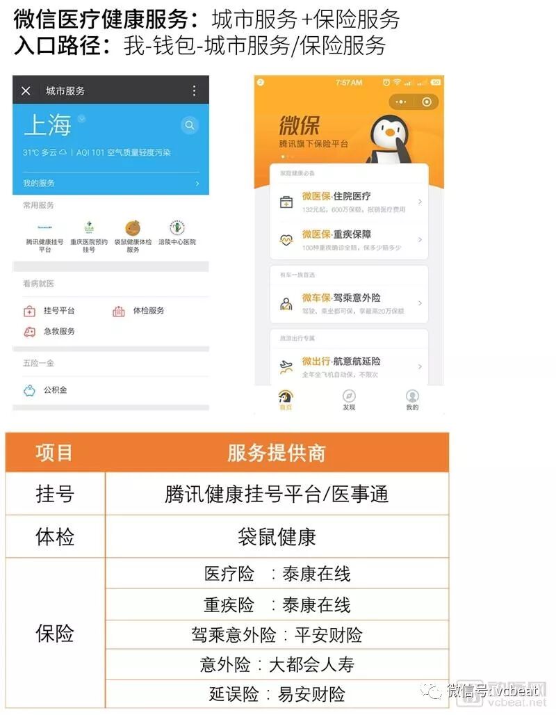微信的医疗健康服务包含两部分,一部分是在城市服务中的挂号和体检预约服务,挂号服务号源有来自自建的腾讯健康挂号平台,也有来自医事通。
