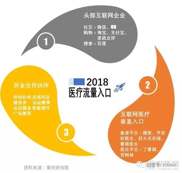 按照流量的来源差异,我们将主要医疗流量入口分为三类:头部互联网企业、互联网医疗垂直入口和异业合作伙伴。