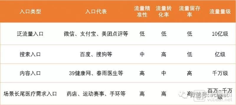 从泛流量入口进入医疗健康服务的人群特征杂乱,需求不明了,所以在精准性、转化率、留存率三个指标上都不占优。