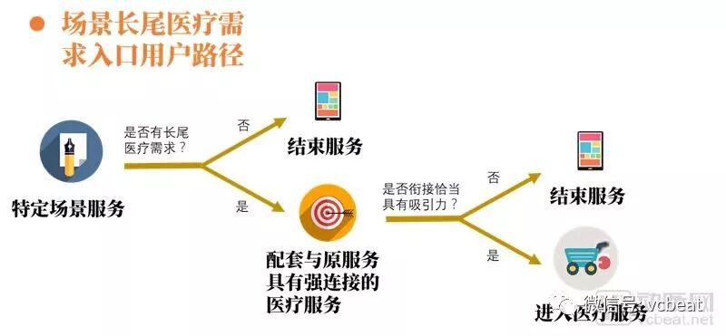 场景长尾医疗价值的挖掘是我们认为的新流量入口的寻找方向。这类场景入口的用户路径通常是在特点服务场景中存在着医疗服务需求,通过设定顺畅的连接,将原有的服务价值拓展,实现对用户需求的深度挖掘和满足。