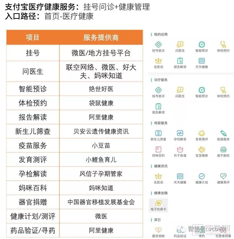 这一类入口是以微信、支付宝、美团大众为代表的超级应用,他们的用户覆盖了大多数网民群体,特别是在移动互联网时代,他们通过社交、电商等业务基本占领了所有的无特定需求流量入口,我们将他称之为“泛流量入口”。他们将医疗健康类服务的二级入口,并且根据各自定位不同,设置不同的业务范围和服务类型,不过主要的服依然是挂号问诊和健康管理。