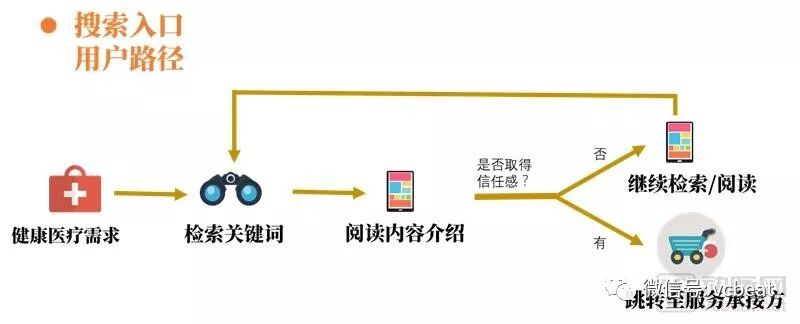 搜索入口的用户大部分已经有了即时的医疗需求,希望通过检索进入服务端。通常搜索引擎提供的结果较多且结果呈现无差别,用户需要进行大量的内容阅读,在选取出信任的服务端之后,进入到服务端。