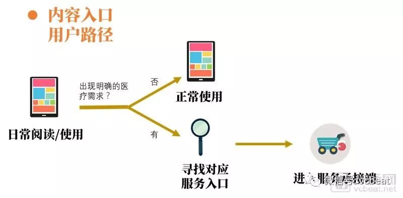 场景需求入口的用户为上一场景中的用户,用户画像清晰,需求明确,只用需求挖掘得到,因为已经建立信任关系,粘性较强。该用户路径的关键在于能否挖掘到特定场景下的用户需求和提供恰到的医疗健康服务。综上,场景入口精准性、转化率、留存率均占优。
