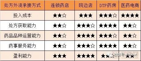 从处方获取能力、药品品种获取能力、药事服务能力、成本投入、盈利能力等维度,我们对当下主要的几种处方外流承接方式进行了打分,获得了下表: