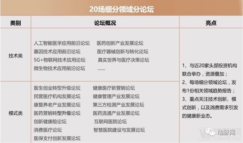 20场细分领域分论坛方面,将与顶级投资机构/协会联合举办,细分领域包括医生创业转型升级论坛、医保支付创新论坛、5G+物联网论坛、消费医疗论坛、医药营销转型升级论坛、创新健康险论坛、真实世界与医疗决策论坛、健康医疗创新零售论坛、微生物技术应用论坛等等。