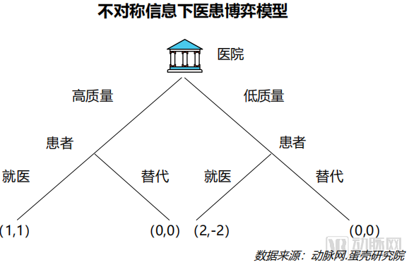 根据不对称信息下医患博弈模型,如果患者认为医院会提供高质量的医疗服务,那么患者选择就医,而医院知道这 一点,就会选择提供低质量的医疗服务,此时医院的利润为2,远远高于正常的利润水平,说明医院获取了超额利润,而患者的效用为-2,利益受到损害,而患者对此事先并不知道。