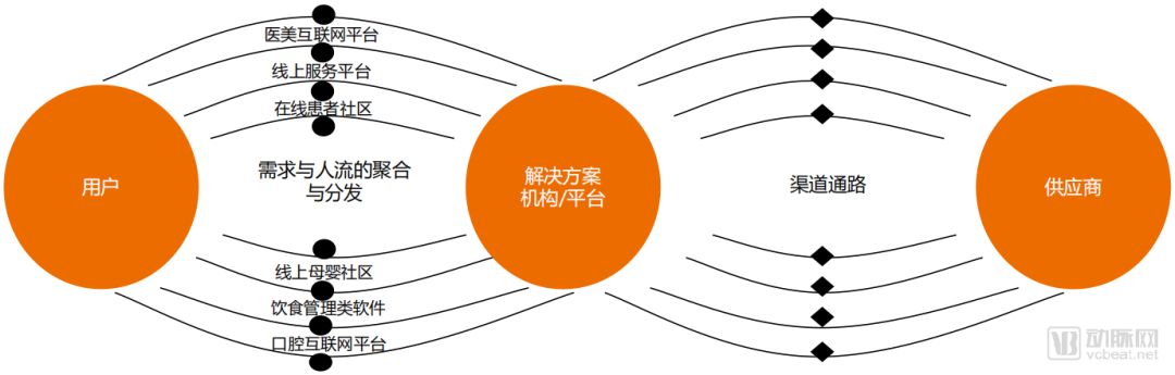 示意图中,橙色是互联网医院围绕不同用户群的业务环节,黄色为相应环节所连接的参与者。目前,互联网医院以医疗机构、医生为核心,通过自建或合作的业务,几乎已经连接了医疗健康产业里的参与者。