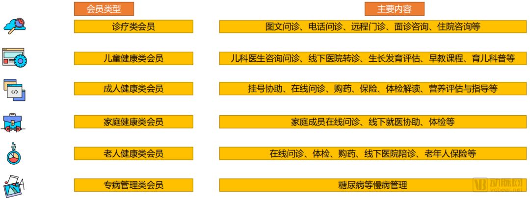 我们梳理除了各大互联网医院的主要会员产品类型,这些产品结合了互联网医院的核心诊疗部分以及延伸出的健康管理部分,将不同频次、同一类人群的需求结合起来,为医疗提供附加值,提升资源和需求的匹配程度。会员购买产品后,可享受一定程度的折扣,甚至是部分免费服务。