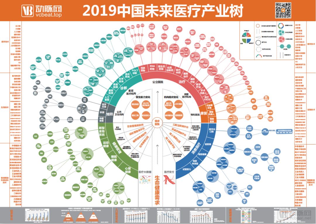 动脉网蛋壳研究院五年来对医疗新科技、新模式进行了持续跟踪和研究,总结出诸如“域”模型、医疗不可能三角、医疗大数据蝴蝶结等模型,在2019年未来医疗100强大会上,发布了《2019未来医疗产业树报告》。