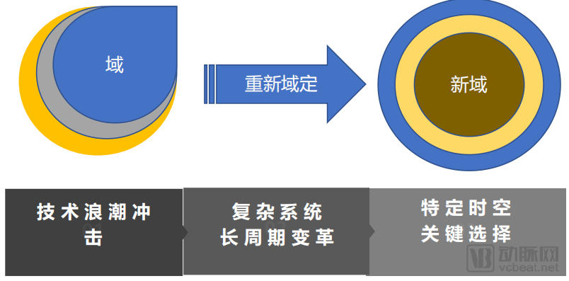 2.域、重新域定:当域里的关键技术逐渐演进最终发生根本性改变的时候,旧域 会跃迁到新域,经济运行模式会在此基础上达到新的稳定,这个过程成为重新域定。