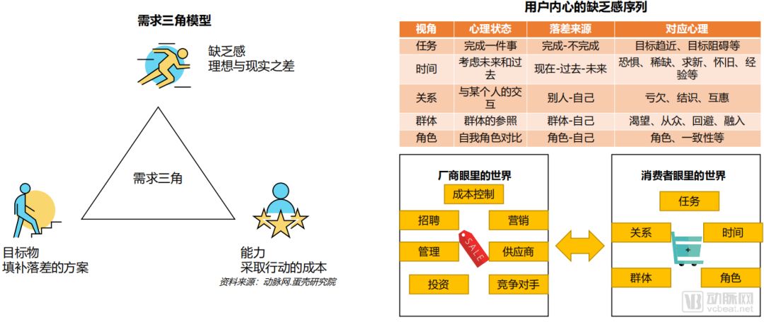 消费需求是由个体在生理上或心理上感到某种欠缺而力求获得满足的一种内心状态,它是个体进行各种活动的基本动力。消费医疗的创新在于立足于用户需求,建立用户模型,开发出创新产品。需求来源于三角模型最上面的缺乏感,厂商需要探索,用户的内心,有哪些缺乏感。