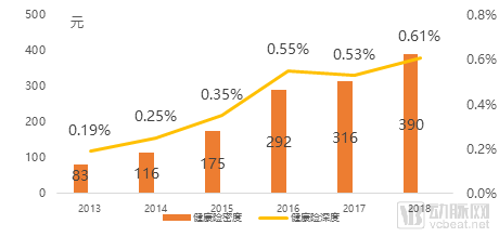 从保费深度和保费密度来看,相对2013年健康险占GDP比例仅为0.169%、人均保费83元,我国健康险迅速发展,2018年分别大幅提升至0.61%和390元/人。