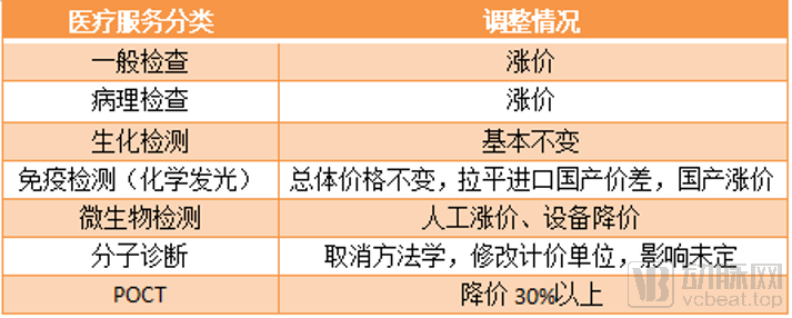 在北京市的价格调整方案中, 检验价格基本稳定,整体有利于国产进口替代。从单个的检测项目来看,一般检查和病理检查收费上涨,生化检测和免疫检测价格没有太大变化,只有个别项目下降。