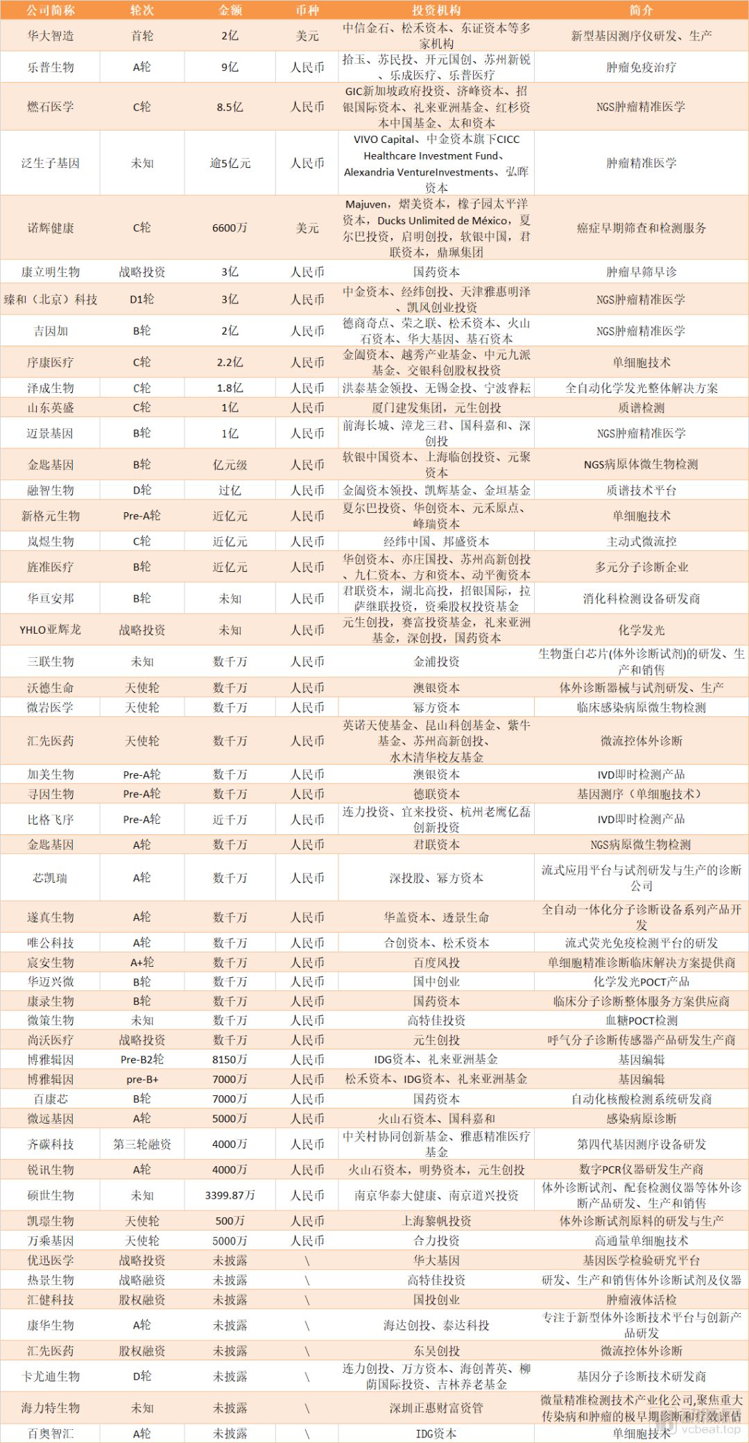 有人退场,也有人登场,从融资名单上,我们可以发现虽然大部分企业依然扎堆在肿瘤液体活检,但超亿元融资案例中也有宏基因组感染病原体诊断、基因编辑、单细胞技术等新力量。