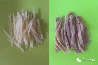 2.平底锅里倒入少许油,将马铃薯丝和火腿丝倒入锅中翻炒。